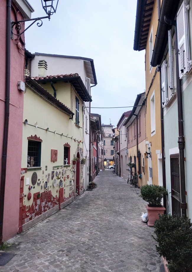 Via Ripe e sullo sfondo il campanile della Chiesa di Santa Maria della Misericordia a Cartoceto, novembre 2018
