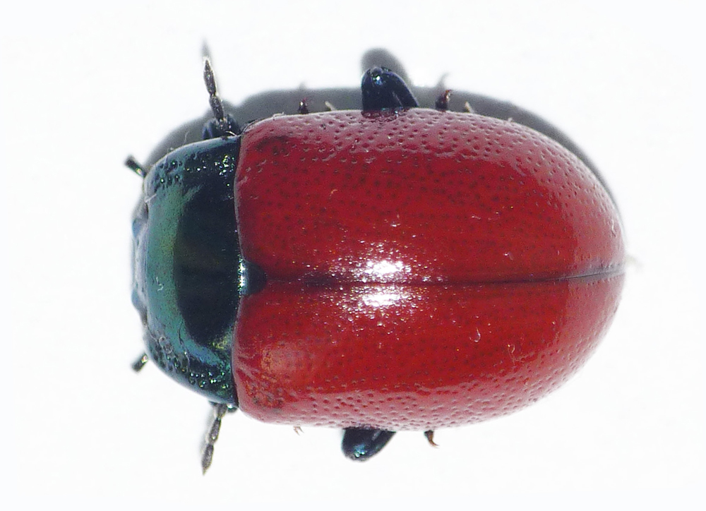 Morfologia: lunghezza 7-10 mm. Capo, pronoto e zampe neri con riflessi metallici bluastri, elitre rosse.